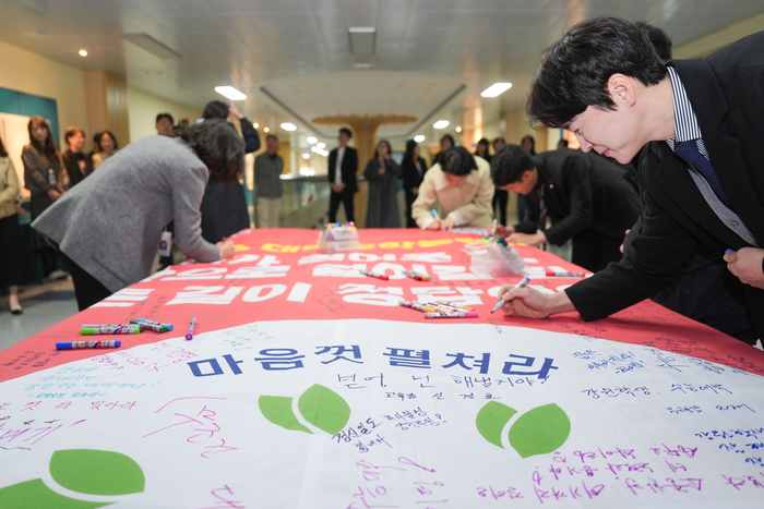 대형 수능 펼침막에 신경호 교육감의 응원 메시지 작성을 시작으로, 도교육청 직원들이 한마음으로 수험생들을 위한 응원 문구를 직접 적으며 한마음으로 격려의 뜻을 전했다.
