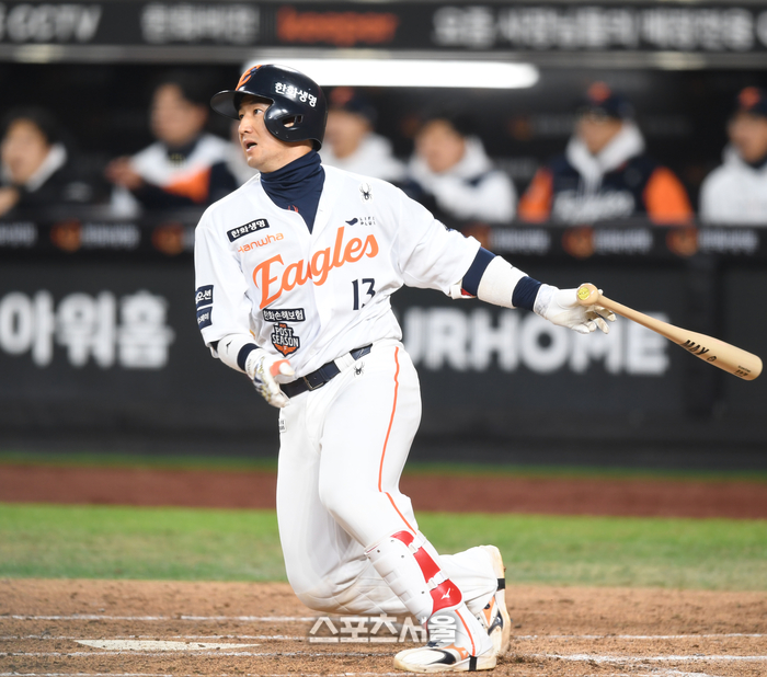 한화 최재훈이 29일 대전 한화생명볼파크에서 열린 2025 KBO 포스트시즌 한국시리즈 3차전 LG와 경기 2회말 1사1,2루 좌전안타를 치고 있다.