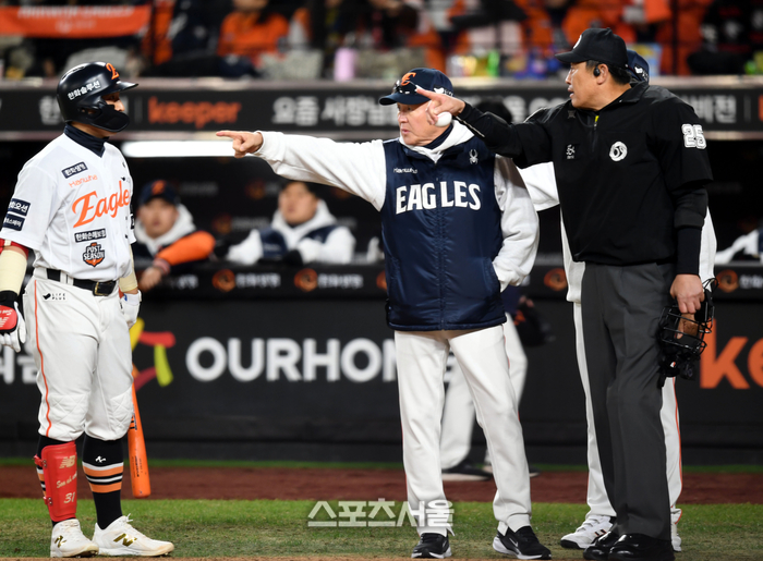 한화 김경문 감독이 29일 대전 한화생명볼파크에서 열린 2025 KBO 포스트시즌 한국시리즈 3차전 LG와 경기 2회말 1사1,2루 이도윤 내야 뜬공 때 LG 유격수 오지환이 고의낙구 후 병살로 이닝을 끝내자 김경문 감독이 나와 주심에게 어필하고 있다.