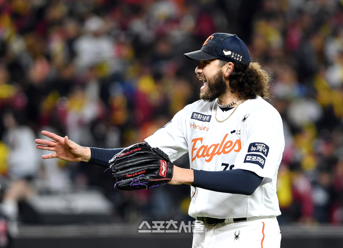 한화 폰세가 29일 대전 한화생명볼파크에서 열린 2025 KBO리그 LG와의 한국시리즈 3차전 2회초 2사 1루 상황에서 LG 박동원을 삼진 아웃으로 잡아낸 뒤 기뻐하고 있다. 2025. 10. 29.