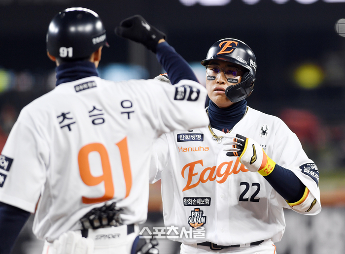 한화 채은성이 29일 대전 한화생명볼파크에서 열린 2025 KBO리그 LG와의 한국시리즈 3차전 2회말 무사 LG 손주영을 상대로 안타를 친 뒤 추승우 코치와 하이파이브를 하고 있다. 2025. 10. 29.