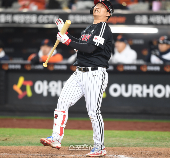 LG 문보경이 29일 대전 한화생명볼파크에서 열린 2025 KBO 포스트시즌 한국시리즈 3차전 한화와 경기 6회초 2사1,2루 헛스윙 후 아쉬워하고 있다.