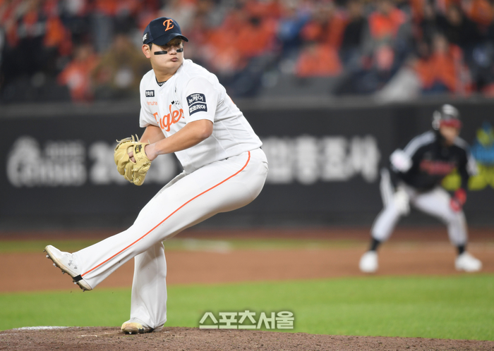 한화 투수 김서현이 29일 대전 한화생명볼파크에서 열린 2025 KBO 포스트시즌 한국시리즈 3차전 LG와 경기 8회 역투하고 있다.