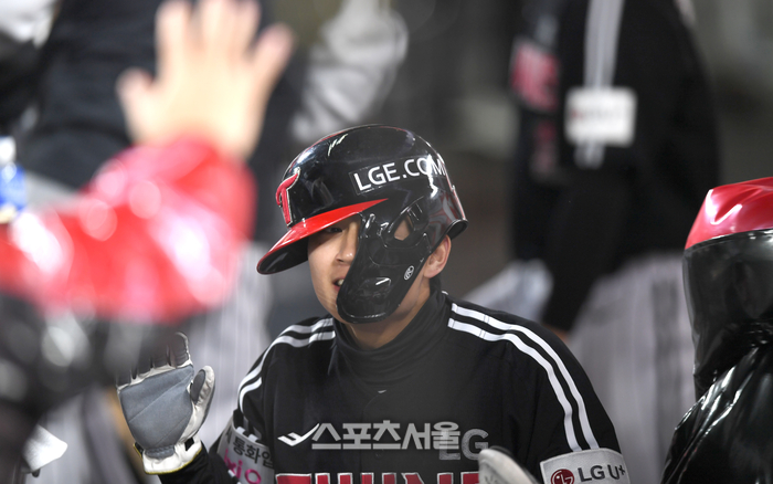 LG 최원영이 29일 대전 한화생명볼파크에서 열린 2025 KBO 포스트시즌 한국시리즈 3차전 한화와 경기 8회초 1사1,3루 상대 투수 폭투를 틈 타 득점을 하고 동료들과 하이파이브를 하고 있다.