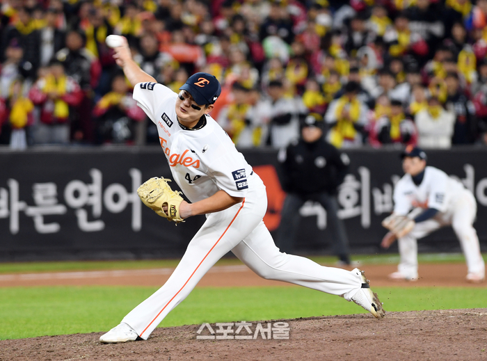 한화 김서현이 29일 대전 한화생명볼파크에서 열린 2025 KBO리그 LG와의 한국시리즈 3차전 8회초 1사 1-3루 상황에서 등판해 힘차게 공을 던지고 있다. 2025. 10. 29.