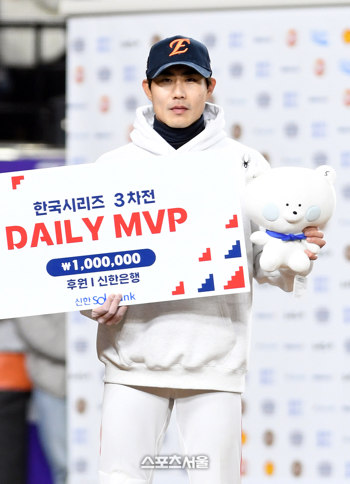 한화 심우준이 29일 대전 한화생명볼파크에서 열린 2025 KBO리그 LG와의 한국시리즈 3차전에서 8회말 결승타를 치며 승리를 이끌고 MVP로 선정된 뒤 기념촬영을 하고 있다. 2025. 10. 29.