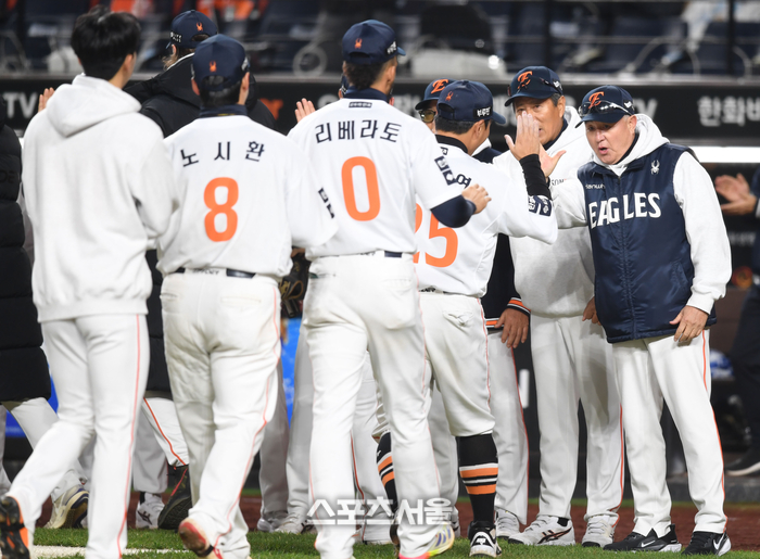 한화 김경문 감독이 29일 대전 한화생명볼파크에서 열린 2025 KBO 포스트시즌 한국시리즈 3차전 LG와 경기승리 후 선수들을 격려하고 있다.