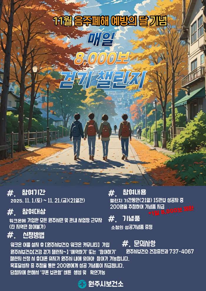 [스포츠서울ㅣ원주=김기원기자]원주시보건소는 11월 음주폐해예방의 달을 기념해 보건소와 함께하는 건강 걷기 챌린지를 운영한다.