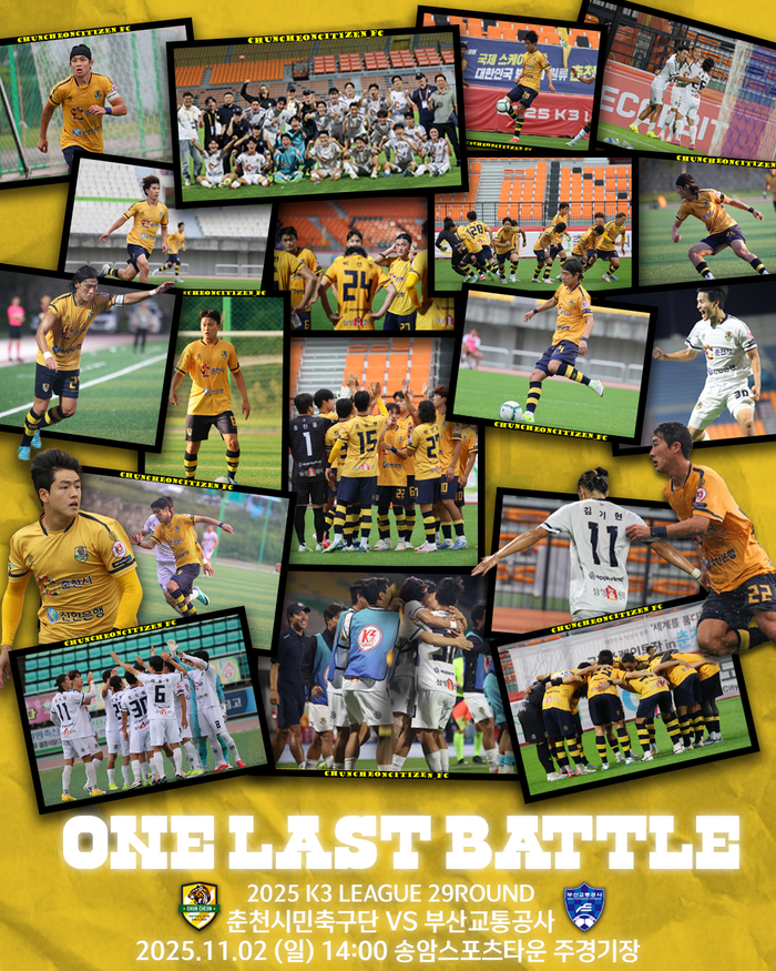 [스포츠서울ㅣ춘천=김기원기자]춘천시민축구단의 2025 시즌 마지막 홈경기가 오는 11월 2일 오후 2시 송암스포츠타운에서 열린다. 시즌 피날레를 장식할 이번 경기는 팬들과 함께하는 특별한 자리로 마련된다.