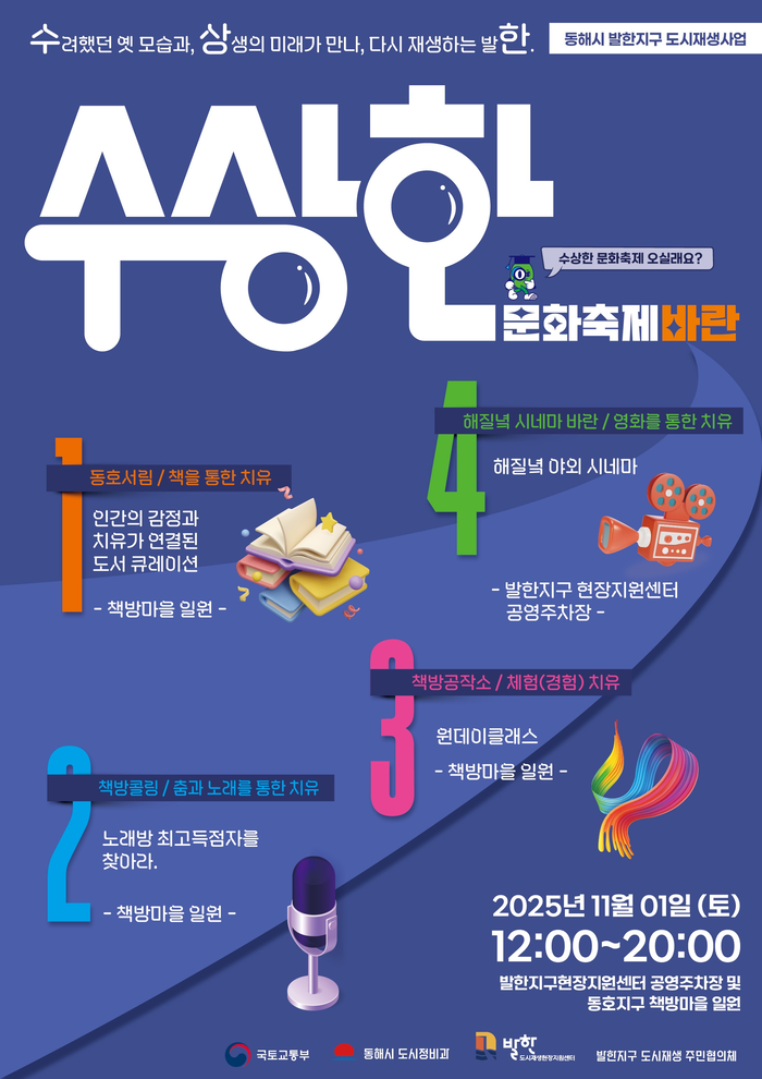 오는 11월 1일 동호 책방마을과 발한지구 현장지원센터 공영주차장 일원에서 열리는 ‘수.상.한. 문화축제’는 묵호 지역의 과거와 현재, 미래를 연결하는 특별한 문화재생의 장을 선보인다.