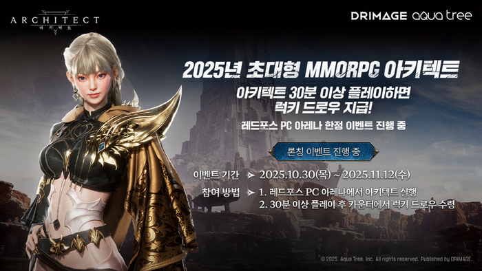더불어 서울 여의도·홍대·강남·을지로 등 주요 도심에서도 이벤트가 열린다. 30일부터 11월 1일까지 진행되는 ‘룰렛 경품 이벤트’에서는 ‘아키텍트’를 다운로드 후 인증한 참가자 전원에게 에너지드링크 ‘삼대오백 바이퍼’를 증정한다. 또한 룰렛 결과에 따라 아키텍트 한정 굿즈도 증정된다.