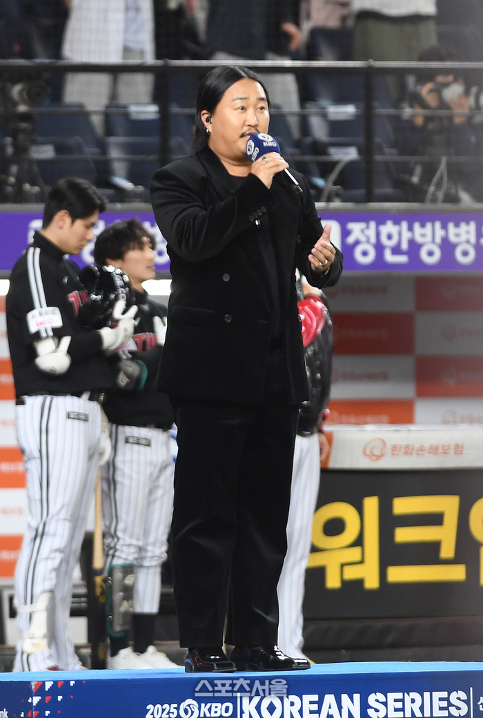 가수 조재즈가 30일 대전 한화생명볼파크에서 열린 2025 KBO리그 LG와 한화의 한국시리즈 4차전에 앞서 애국가를 열창하고 있다. 2025. 10. 30.