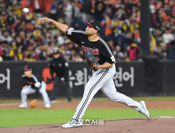 LG 치리노스가 30일 대전 한화생명볼파크에서 열린 2025 KBO리그 한화와의 한국시리즈 4차전에 선바 등판해 힘차게 공을 던지고 있다. 2025. 10. 30.