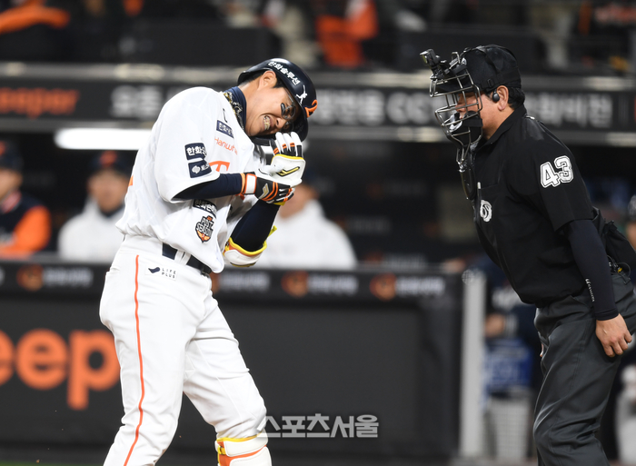한화 채은성이 30일 대전 한화생명볼파크에서 열린 2025 KBO 한국시리즈 4차전 LG와 경기 4회말 무사2루 상대 투수 치리노스의 투구에 맞은 후 고통스러워하고 있다.