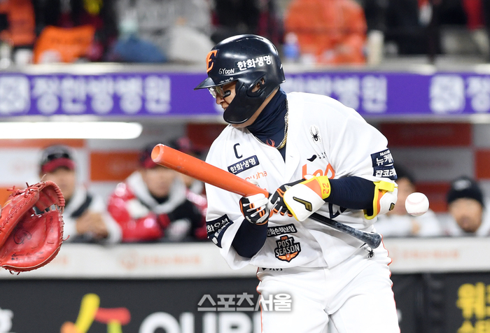 한화 채은성이 30일 대전 한화생명볼파크에서 열린 2025 KBO리그 LG와의 한국시리즈 4차전 4회말 무사 2루 상황에서 LG 선발 치리노스의 투구에 손등을 맞고 있다. 2025. 10. 30.