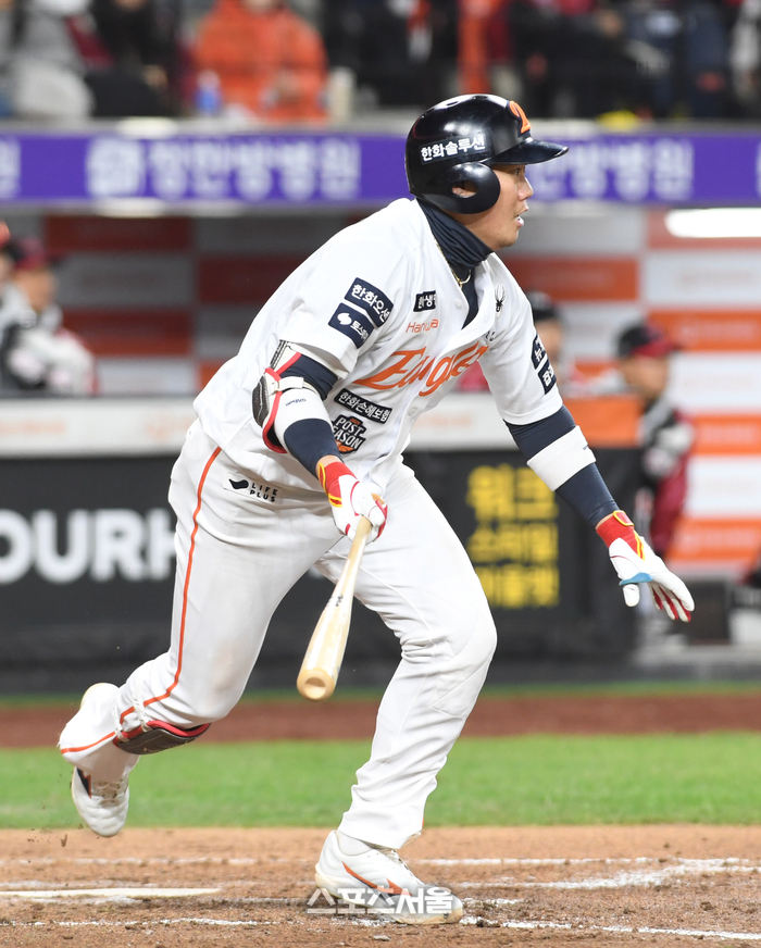 한화 하주석이 30일 대전 한화생명볼파크에서 열린 2025 KBO리그 LG와의 한국시리즈 4차전 4회말 1사 2-3루 상황에서 LG 선발 치리노스를 상대로 1타점 내야 땅볼을 치고 있다. 2025. 10. 30.