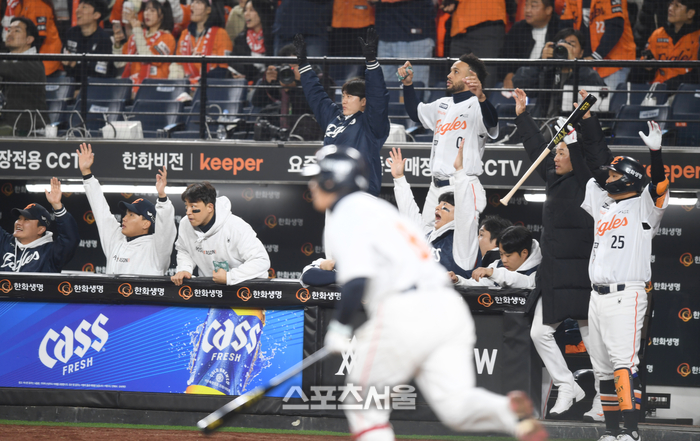 한화 선수들이 30일 대전 한화생명볼파크에서 열린 2025 KBO 한국시리즈 4차전 LG와 경기 6회말 노시환의 타구가 뻗자 환호하고 있다.