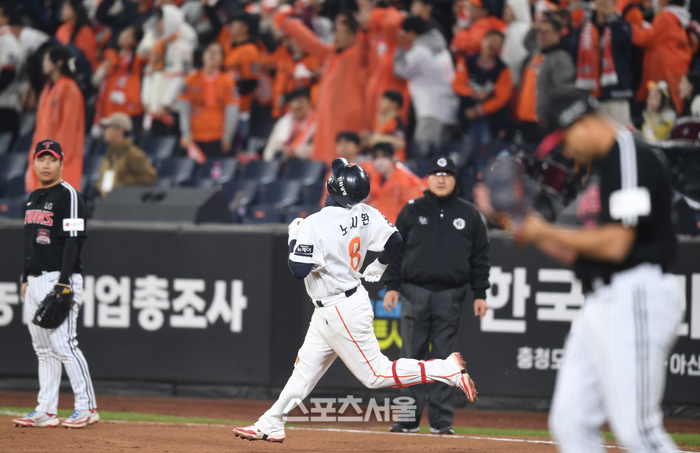 한화 노시환이 30일 대전 한화생명볼파크에서 열린 2025 KBO 한국시리즈 4차전 LG와 경기 6회말 자신의 타구가 상대 중견수에 잡히자 아쉬워하고 있다.