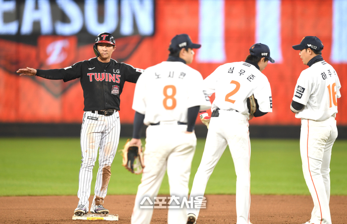 LG 오지환이 30일 대전 한화생명볼파크에서 열린 2025 KBO 한국시리즈 4차전 한화와 경기 7회초 1사1루 박동원 내야땅볼 때 2루에서 비디오판독 결과를 기다리고 있다.