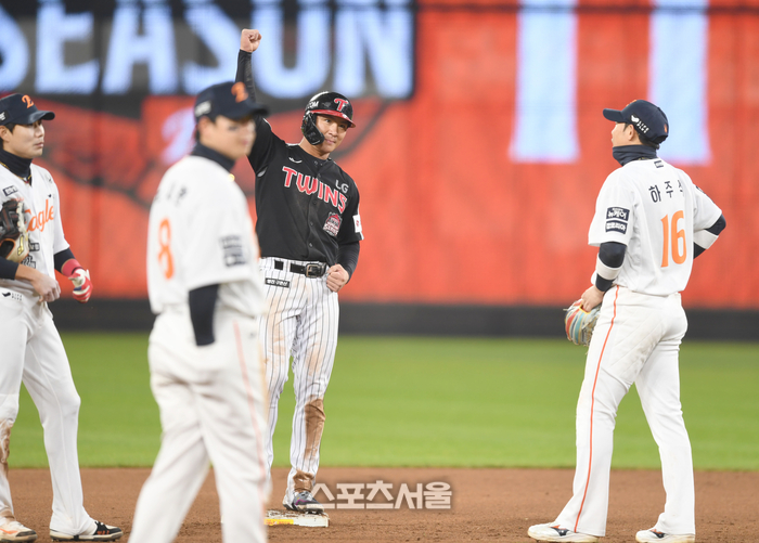 LG 오지환이 30일 대전 한화생명볼파크에서 열린 2025 KBO 한국시리즈 4차전 한화와 경기 7회초 1사1루 박동원 내야땅볼 때 비디오판독 결과 2루에서 세이프되자 환호하고 있다.