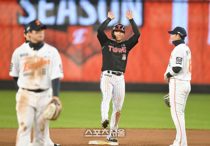 LG 오지환이 30일 대전 한화생명볼파크에서 열린 2025 KBO 한국시리즈 4차전 한화와 경기 7회초 1사1루 박동원 내야땅볼 때 비디오판독 결과 2루에서 세이프되자 환호하고 있다.