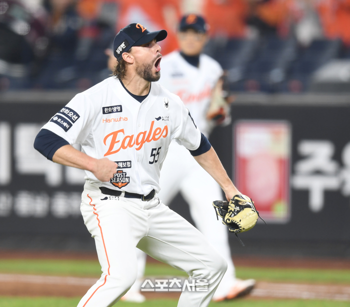 한화 선발투수 와이스가 30일 대전 한화생명볼파크에서 열린 2025 KBO 한국시리즈 4차전 LG와 경기 7회초 1사1,2루 상대 문성주를 병살타로 처리한 후 환호하고 있다.