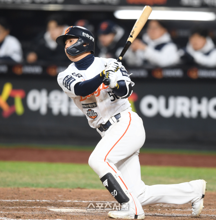 한화 이원석이 30일 대전 한화생명볼파크에서 열린 2025 KBO 한국시리즈 4차전 LG와 경기 8회말 1사 좌전안타를 치고 있다.