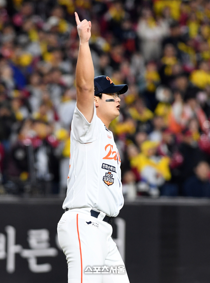 한화 김서현이 30일 대전 한화생명볼파크에서 열린 2025 KBO리그 LG와의 한국시리즈 4차전 8회초 2사 1-2루 상황에서 LG 오스틴의 타구가 내야로 뜨자 손가락으로 가리키고 있다. 2025. 10. 30.