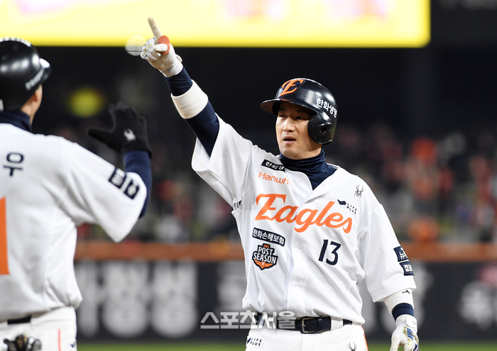 한화 최재훈이 30일 대전 한화생명볼파크에서 열린 2025 KBO리그 LG와의 한국시리즈 4차전 8회말 2사 2루 상황에서 LG 이정용을 상대로 1타점 적시타를 친 뒤 세리머니를 하고 있다. 2025. 10. 30.