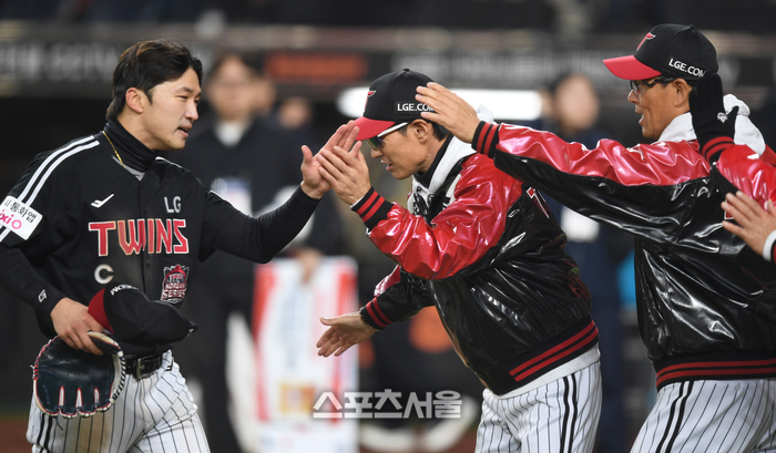 LG 주장 박해민이 30일 대전 한화생명볼파크에서 열린 2025 KBO 한국시리즈 4차전 한화와 경기 승리 후 염경엽 감독과 하이파이브를 하고 있다.
