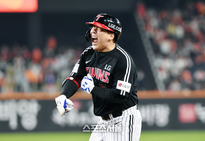 LG 김현수가 30일 대전 한화생명볼파크에서 열린 2025 KBO리그 한화와의 한국시리즈 4차전 9회초 2사 2-3루 상황에서 역전 2타점 적시타를 친 뒤 포효하고 있다. 2025. 10. 30.