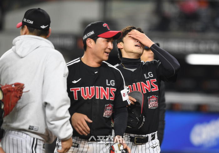 LG 박해민이 30일 대전 한화생명볼파크에서 열린 2025 KBO 한국시리즈 4차전 한화와 경기 승리 후 눈물을 흘리고 있다.
