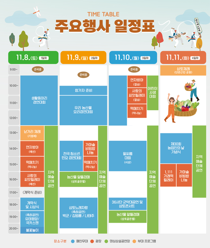 한편 삼토페스티벌은 11월 8일부터 11일까지 4일간 댄싱공연장에서 열리며, 개막식과 시상식을 비롯해, 농특산물 판매, 전시, 체험, 경연, 공연 등 다채로운 행사가 마련된다. 특히 11일에는 농업인의 날 국가기념식이 진행될 예정이다.