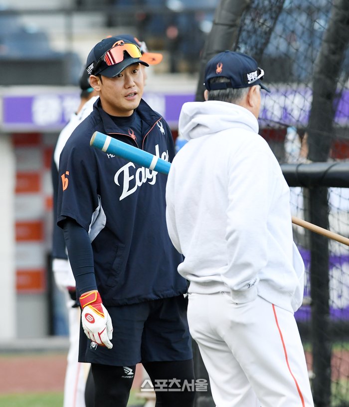 한화 하주석(왼쪽)이 31일 대전 한화생명볼파크에서 열린 2025 KBO리그 LG와의 한국시리즈 5차전에 앞서 훈련 중 김경문 감독과 이야기를 나누고 있다. 2025. 10. 31.