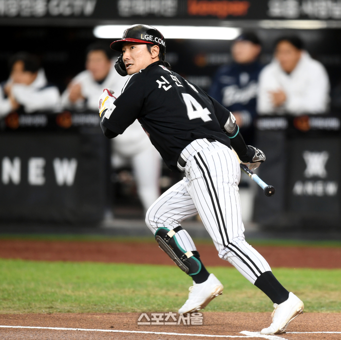 LG 신민재가 31일 대전 한화생명볼파크에서 열린 2025 KBO 한국시리즈 5차전 한화와 경기 1회초 1사 2루타를 친 후 1루로 달려나가고 있다.