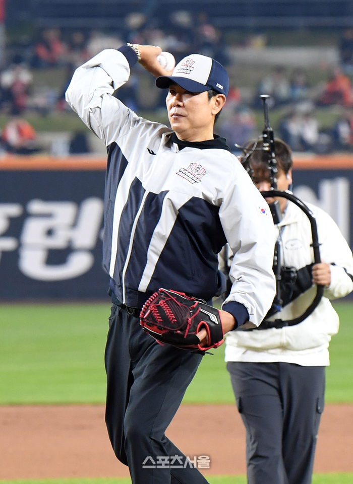 한화 이글스의 레전드 정민철이 31일 대전 한화생명볼파크에서 열린 2025 KBO리그 LG와 한화의 한국시리즈 5차전에 앞서 시구를 하고 있다. 2025. 10. 31.
