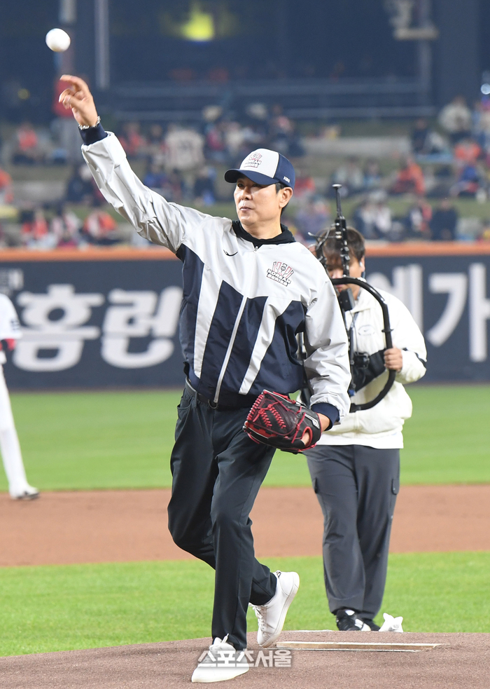 한화 이글스의 레전드 정민철이 31일 대전 한화생명볼파크에서 열린 2025 KBO리그 LG와 한화의 한국시리즈 5차전에 앞서 시구를 하고 있다. 2025. 10. 31.