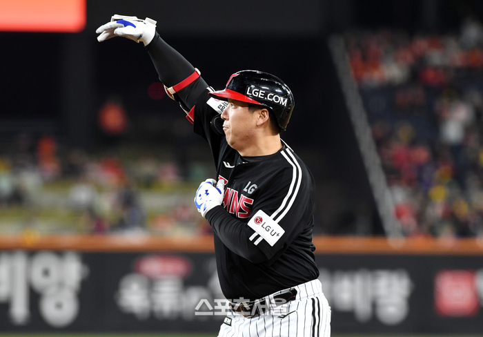 LG 김현수가 31일 대전 한화생명볼파크에서 열린 2025 KBO리그 한화와의 한국시리즈 5차전 1회초 1사 2루 상황에서 한화 선발 문동주를 상대로 1타점 적시타를 친 뒤 세리머니를 하고 있다. 2025. 10. 31.
