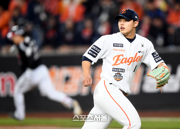 한화 선발투수 문동주가 31일 대전 한화생명볼파크에서 열린 2025 KBO 한국시리즈 5차전 LG와 경기 1회초 1사2루 김현수 적시타 때 타구를 쳐다보고 있다.