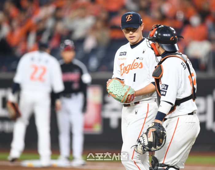 한화 선발투수 문동주가 31일 대전 한화생명볼파크에서 열린 2025 KBO 한국시리즈 5차전 LG와 경기 1회초 1사2루 상대 김현수에 적시타를 맞은 후 포수 최재훈과 이야기를 나누고 있다.