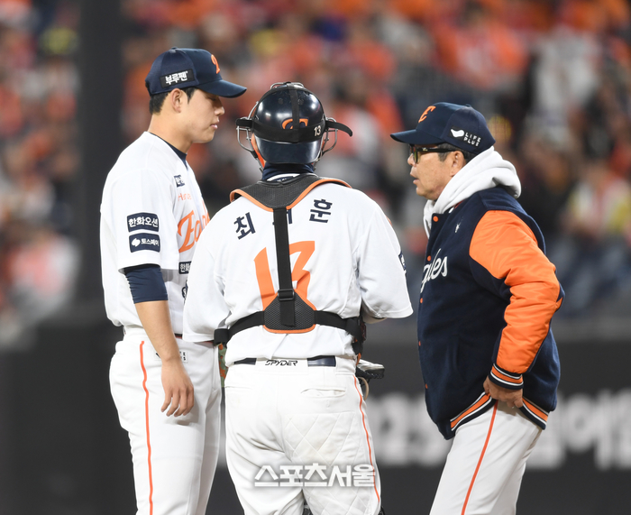 한화 문동주가 31일 대전 한화생명볼파크에서 열린 2025 KBO 한국시리즈 5차전 LG와 경기 1회초 2사1,3루 오지환 타석 때 마운드를 방문한 양상문 코치의 이야기를 듣고 있다.