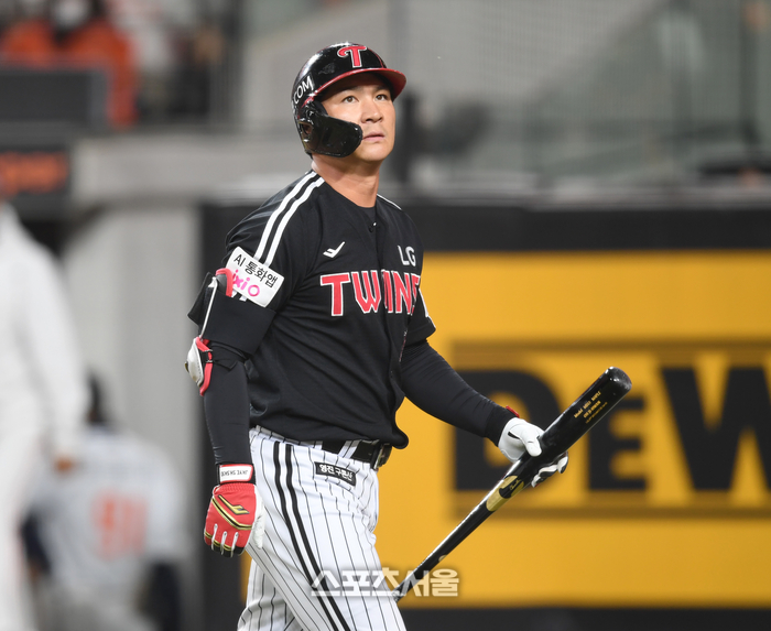 LG 오지환이 31일 대전 한화생명볼파크에서 열린 2025 KBO 한국시리즈 5차전 한화와 경기 1회초 2사1,3루 헛스윙 삼진아웃을 당한 후 더그아웃으로 들어오고 있다.