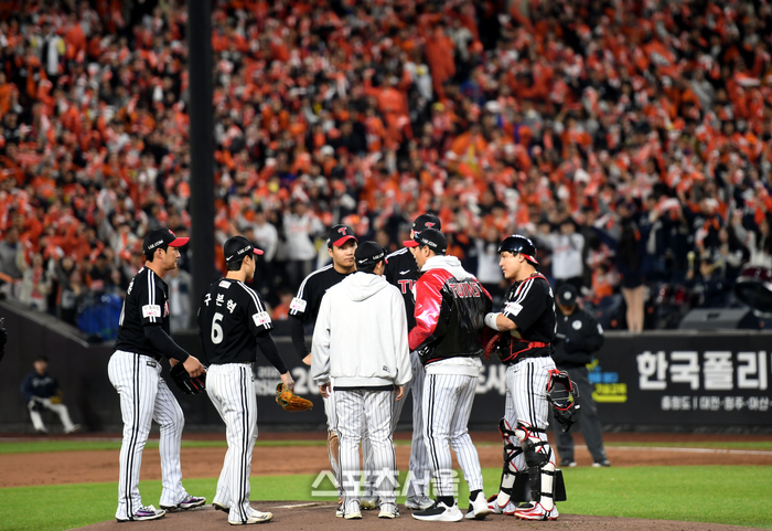 LG 김광삼 코치가 31일 대전 한화생명볼파크에서 열린 2025 KBO 한국시리즈 5차전 한화와 경기 2회말 1사만루 이원석 타석 때 마운드를 방문해 작전지시를 하고 있다.