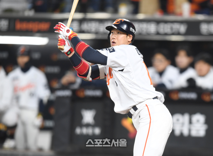 한화 하주석이 31일 대전 한화생명볼파크에서 열린 2025 KBO 한국시리즈 5차전 LG와 경기 2회말 1사1루 2루타를 친 후 타구를 바라보고 있다.