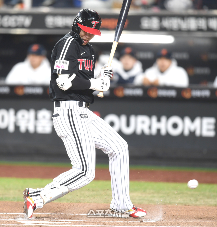 LG 홍창기가 31일 대전 한화생명볼파크에서 열린 2025 KBO 한국시리즈 5차전 한화와 경기 6회초 상대 투수 김종수의 투구에 맞고 있다.