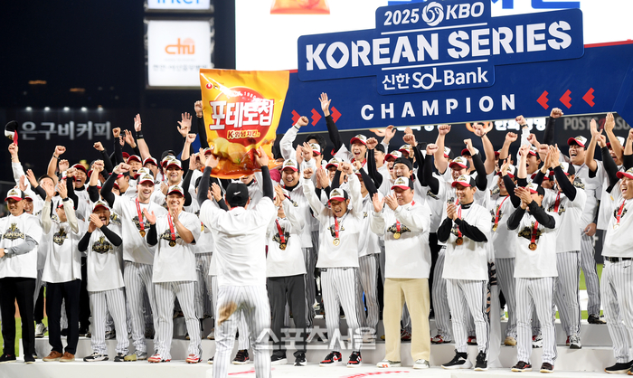 LG 선수단이 31일 대전 한화생명볼파크에서 열린 2025 KBO 한국시리즈 우승 시상식 5차전 포텐터짐상을 수상한 오지환을 축하해 주고 있다.