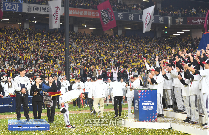 LG 염경엽 감독이 31일 대전 한화생명볼파크에서 열린 2025 KBO 한국시리즈 우승 시상식에서 우승감독상으로 호명되자 선수단에 인사를 하고 있다.