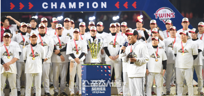 LG 염경엽 감독이 31일 대전 한화생명볼파크에서 열린 2025 KBO 한국시리즈 우승 시상식에서 감독상을 수상한 후 소감을 말하고 있다.