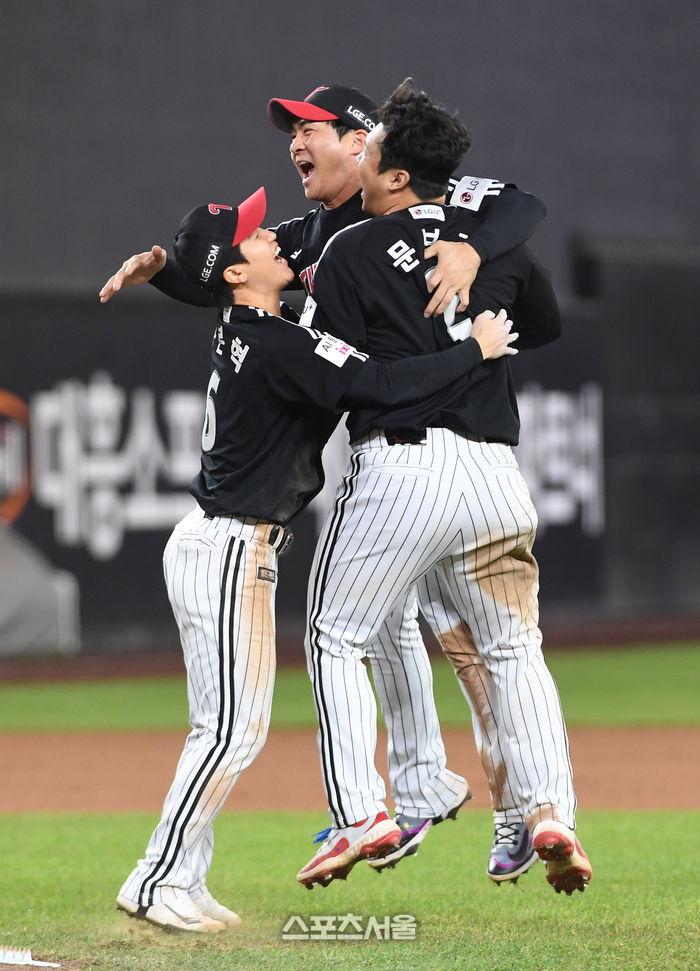LG 구본혁(왼쪽)과 오지환(가운데), 문보경이 31일 대전 한화생명볼파크에서 열린 2025 KBO리그 한화와의 한국시리즈 5차전에서 승리하며 통합 우승을 차지한 뒤 함께 기쁨을 나누고 있다. 2025. 10. 31.