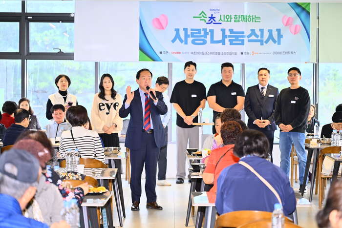 [스포츠서울ㅣ김기원기자]속초아이파크스위트호텔(총지배인 김민경)은 10월 31일, 호텔 개별 분양자 450여 명이 구성한 속초아이파크스위트호텔 수분양자협의회(회장 김진환) 주관으로 지역 어르신과 장애인 등 취약계층 200여 명을 초청해 ‘속초시와 함께하는 사랑의 나눔식사 행사’를 개최했다.
